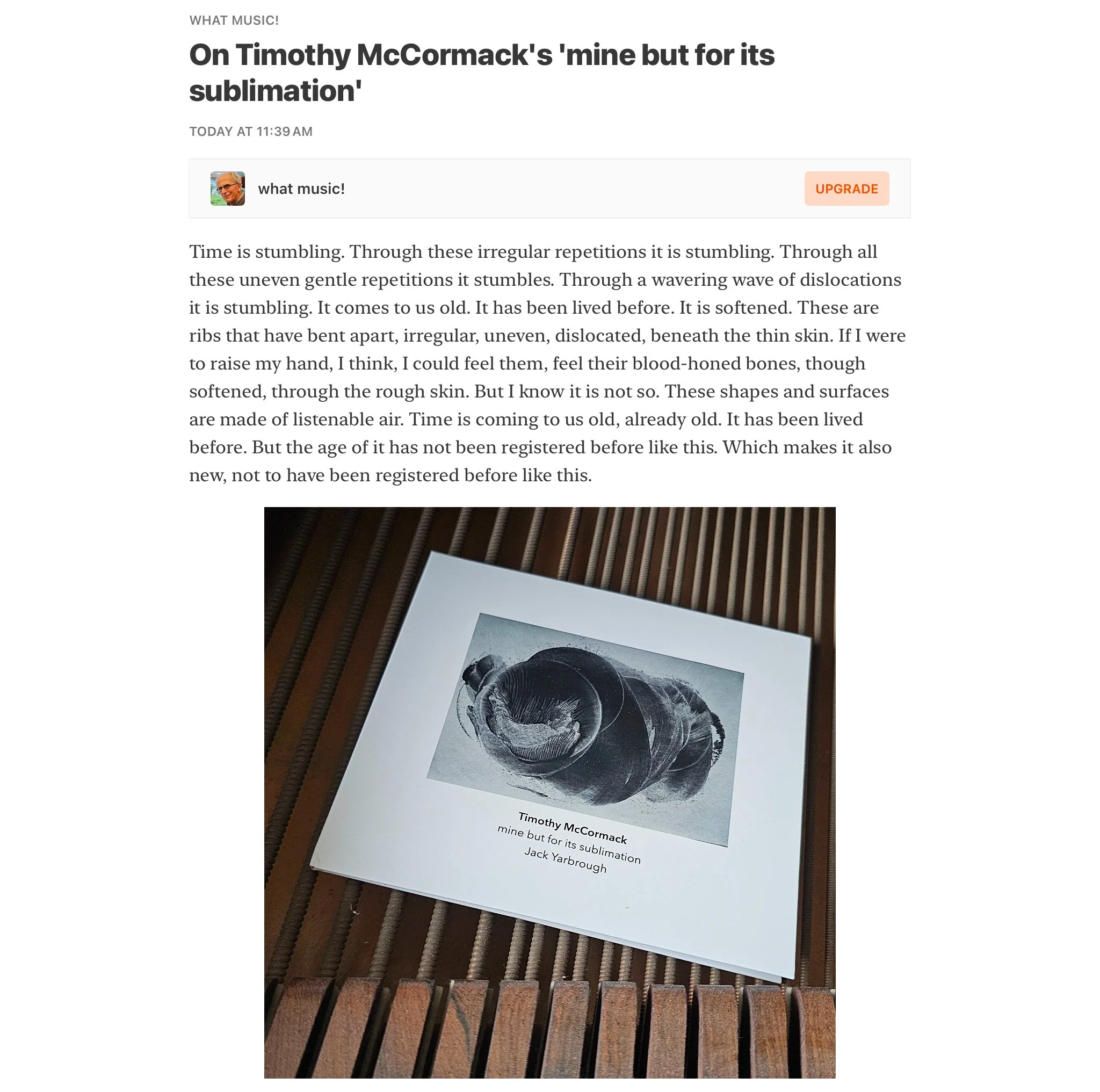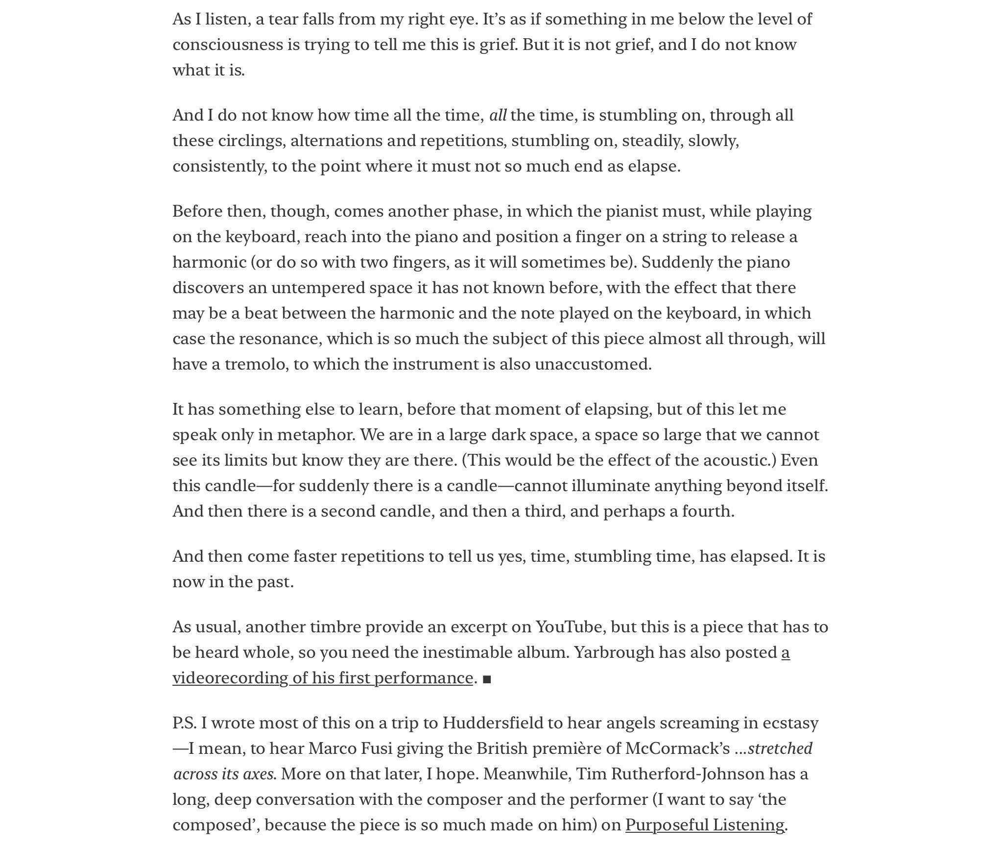 In March of 2026, Paul Griffiths wrote an essay on mine but for its sublimation for his Substack, what music! Griffiths wrote this text within a day of hearing the recording on Another Timbre (Jack Yarbrough, piano) for the first time, and on the same day that he heard Marco Fusi perform my viola solo …stretched across its axes in Huddersfield, UK.